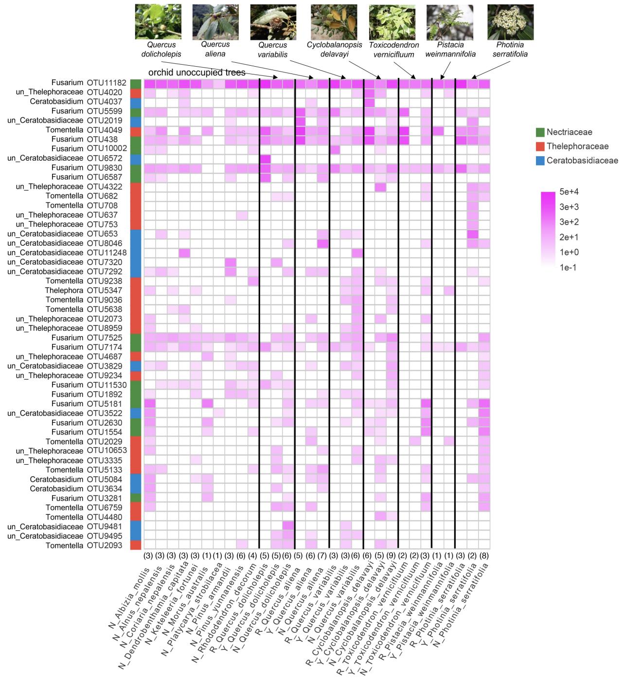 本研究以中国特有金沙江石斛(Dendrobium wangliangii)为材料,研究首先发现金沙江石斛偏好附生于壳斗科植物(Fig. 1)。利用迁地共生萌发,从偏好性附生宿主植物的树皮中鉴定出Fusarium属促萌发真菌。原生境共萌发试验表明,仅在金沙江石斛偏好附生的宿主物种上观察到原球茎和幼苗的形成。真菌群落结构分析进一步表明,具促萌发功能的Fusarium属真菌(OTU11182)在金沙江石斛所生长群落中所有树种的树皮上丰度高且广泛分布(Fig. 2),表明这种附生兰科植物的宿主偏好性不受促萌发共生真菌分布的限制。针对依赖真菌才能实现种子萌发的附生植物而言,生物因子不是附生植物与宿主间特化关系形成的关键,推断附生植物偏好性可能是由宿主树皮的非生物因素所造成的。