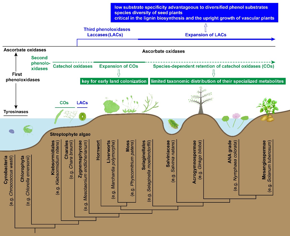 酚类化合物对植物适应陆地环境至关重要,其多样化也是物种多样性的表现形式之一。酚酶包括儿茶酚酶(COs,植物中通常指PPOs)和漆酶(LACs),负责酚类物质的氧化和聚合。然而,不同种类酚酶的起源、进化以及在植物演化和陆地定植过程中的差异功能不清楚。该研究表明酚酶在植物演化过程中经历了更新和迭代,伴随着植物酚类底物越来越多样化,催化酚类氧化聚合的酚酶也“鸟枪换炮“,从藻类中底物单一的酪氨酸酶,早期陆生植物中的儿茶酚酶,在维管植物中逐渐被底物宽泛的漆酶取代(图2)。在部分种子植物如园艺类苹果和土豆中,儿茶酚酶被大量保留,论文探讨了儿茶酚酶物种特异性保留的演化原因和生态适应意义。该论文阐释了植物界广泛存酚酶的起源和演化问题,为利用酚酶开展植物资源保护利用和环境适应研究,提供了强有力的理论支撑。该成果bat365中文官方网站教师廖菊够为第一作者,陈穗云教授为通讯作者。