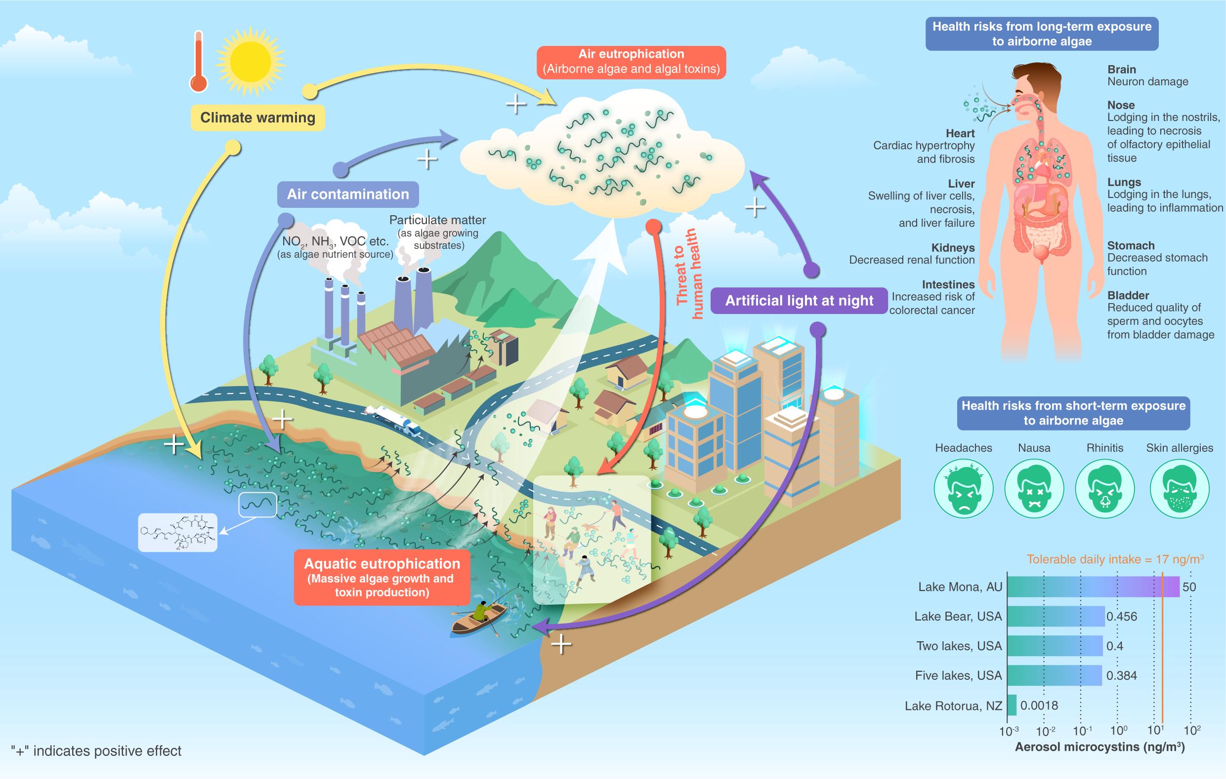 进一步,该团队在经典“水体富营养化aquatic eutrophication”概念基础上提出“空气富营养化air eutrophication”新概念,以“Will ‘air eutrophication’ increase the risk of ecological threat to public health?”为题发表于Environmental Science & Technology(IF=11.4)上。该论文指出,水体富营养化可与其它环境变化相互作用,从而对陆地系统产生意想不到的级联效应,例如水体藻类通过各种过程进入空气中形成气溶胶并得以进一步发展,进而对人和动物形成健康暴露风险。在各种人为因素包括水体富营养化、气候变暖、空气污染和人工夜间灯光的催化下,预计未来“空气富营养化”过程将加速发展,对公众健康和环境构成潜在的威胁(图2)。因此,该论文呼吁关注“空气富营养化”过程,并提出了跨学科研究议程。该成果以bat365中文官方网站博士研究生孙彦峰为第一作者,王海军研究员和谢平研究员为通讯作者。