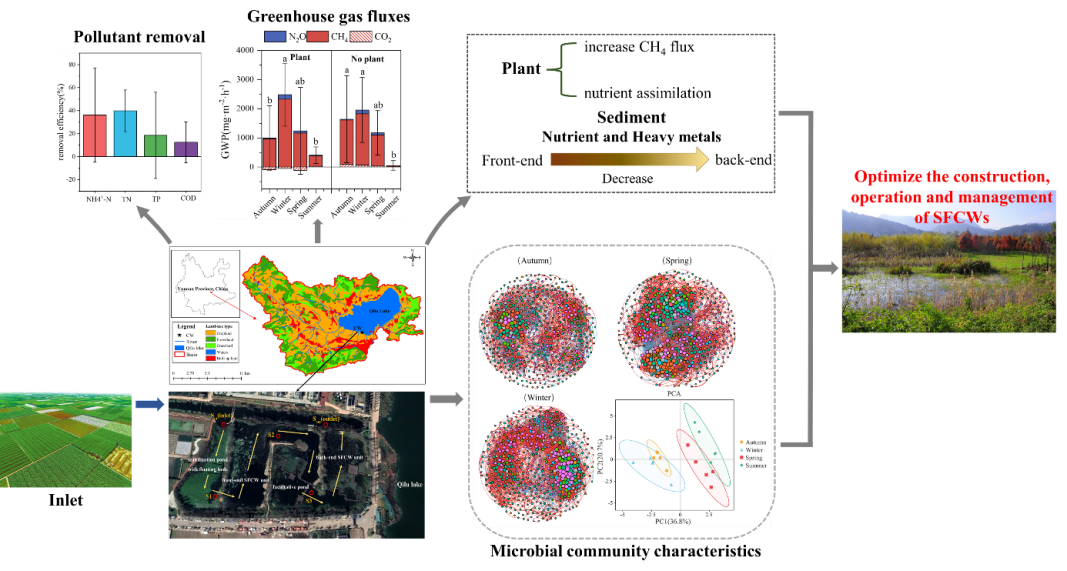 农业面源污染已成为云南高原湖泊的重要污染来源,构建设施拦截、净化农业面源污染是保护湖泊水环境的重要手段。人工湿地因建设运行成本低、生态友好等特点而被广泛应用于湖泊流域内面源污染的净化。然而,许多人工湿地存在设计建设不合理、运行管理不善以及缺乏优化提升方法等问题,导致环境生态效益不佳。课题组以云南高原湖泊杞麓湖湖滨某用于净化农田径流的人工湿地为典型代表,系统考察了其周年内的污染物净化效能、温室气体排放通量、优势植物氮磷吸收、重金属等污染累积以及微生物群落特征,结果表明,人工湿地对污染物的去除效能存在较大的季节性波动,秋季时的脱氮效果最佳。整体上湿地的进水污染负荷过大,对COD和P的去除效果均不理想。人工湿地是CH4的排放热区,尤其在污染物累积较为严重的湿地前端区域。水生植物的存在导致了更多CH4的排放。底泥中重金属累积已显现出一定的生态风险,其与氮磷含量呈正相关。湿地秋冬季的微生物群落特征与春夏季明显不同,春季的微生物网络结构更为复杂,而秋季时微生物网络中存在更多关键物种,结构更稳定。此外,本论文还提出了关于优化人工湿地设计、运行与管理的若干相关建议。成果以Seasonal purification efficiency, greenhouse gas emissions and microbial community characteristics of a field-scale surface-flow constructed wetland treating agricultural runoff发表在生态环境领域期刊 Journal of Environmental Management(中科院一区,IF:8.7) 上。生态学硕士生陈小弯和资源环境博士生邓盛炯为第一作者,常军军教授为通讯作者。全文链接https://www.sciencedirect.com/science/article/abs/pii/S0301479723016596.