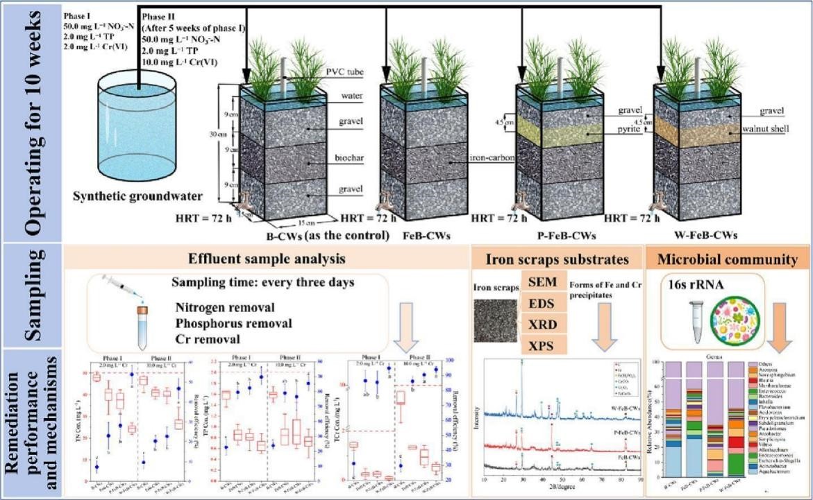 地下水常因地表污染物淋溶、下渗等作用而受到污染,NO3-、PO43-和重金属(如Cr、As)是地下水中常见的污染物,而地下水中生物可利用碳源的含量较低,微生物活性差,致使污染物难以自然消除,需采取措施予以净化后方可进行资源化利用。在国家级大学生创新创业训练项目“铁碳微电解人工湿地净化污染地下水的研究”等的支持下,项目组采用铁屑和生物炭的混合物作为人工湿地基质,并添加硫铁矿和核桃壳作为电子供体,用于处理含NO3-、PO43-和Cr(VI)的地下水。结果表明,与填充传统基质的对照人工湿地相比,铁碳基人工湿地能够对地下水中的三种污染物同步取得显著较好的处理效果,物相分析显示,Cr(VI)被有效地还原为Cr(III)并形成稳定沉淀。核桃壳作为一种农业废弃物,能够通过驱动混合营养反硝化和Cr(VI)还原作用显著增强铁碳基人工湿地净化地下水的效能。而硫铁矿的提升效能不甚理想。铁碳混合物和核桃壳的加入富集了反硝化和Cr(VI)还原菌群,铁与PO43-形成稳定沉淀,进而达到良好的地下水修复效果(图1)。该工作以Simultaneous removal of nitrate, phosphate and Cr(VI) in groundwater by iron-carbon-based constructed wetlands: Performance intensification by organic solid amendments为题发表在Journal of Water Process Engineering(中科院二区,IF:6.3)杂志上,环境科学与工程专业2019级孙婷和2021级胡明达同学为共同第一作者,参与作者包括2021级李宇轩等,2022级毕庆丰等,常军军教授为通讯作者。全文链接:https://www.sciencedirect.com/science/article/pii/S2214714424004483。