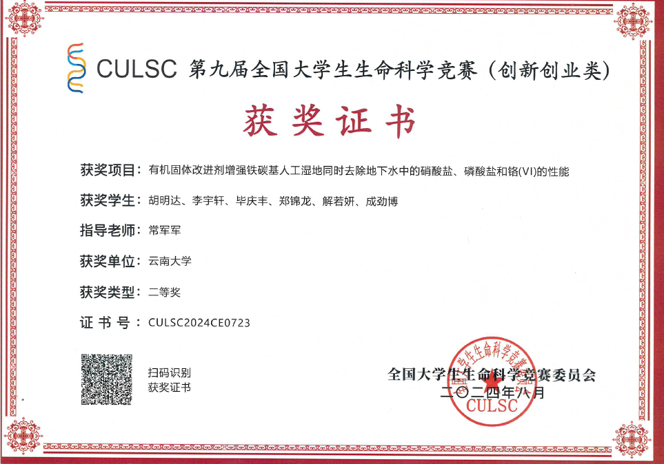 胡明达等同学基于该研究完成的科技作品“有机固体改进剂增强铁碳基人工湿地同时去除地下水中的硝酸盐、磷酸盐和铬(VI)的性能”获得全国大学生生命科学竞赛(创新创业类)国赛二等奖(图2),作品“饮水洁源——新型铁碳微电解地下水净化系统”获得云南省“互联网+”大学生创新创业大赛金(2022年)、银(2023)奖,指导教师均为常军军教授。
