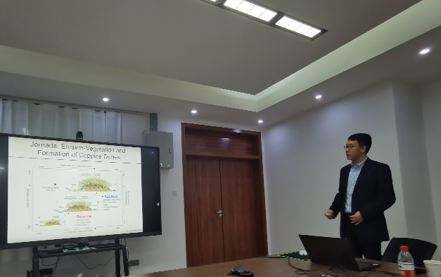 李俊然博士首先针对干旱区半干旱区灌丛化过程、驱动机制及反馈效应做了全面总结,然后以美国西南部干旱区草地生态系统为例,阐述了风蚀和火干扰对灌丛化的影响及其对灌丛肥岛效应的作用机理,通过情景模拟分析,提出了针对不同灌丛化阶段生态恢复和可持续管理的框架。参会人员与李俊然博士围绕相关问题进行了深入讨论与交流。