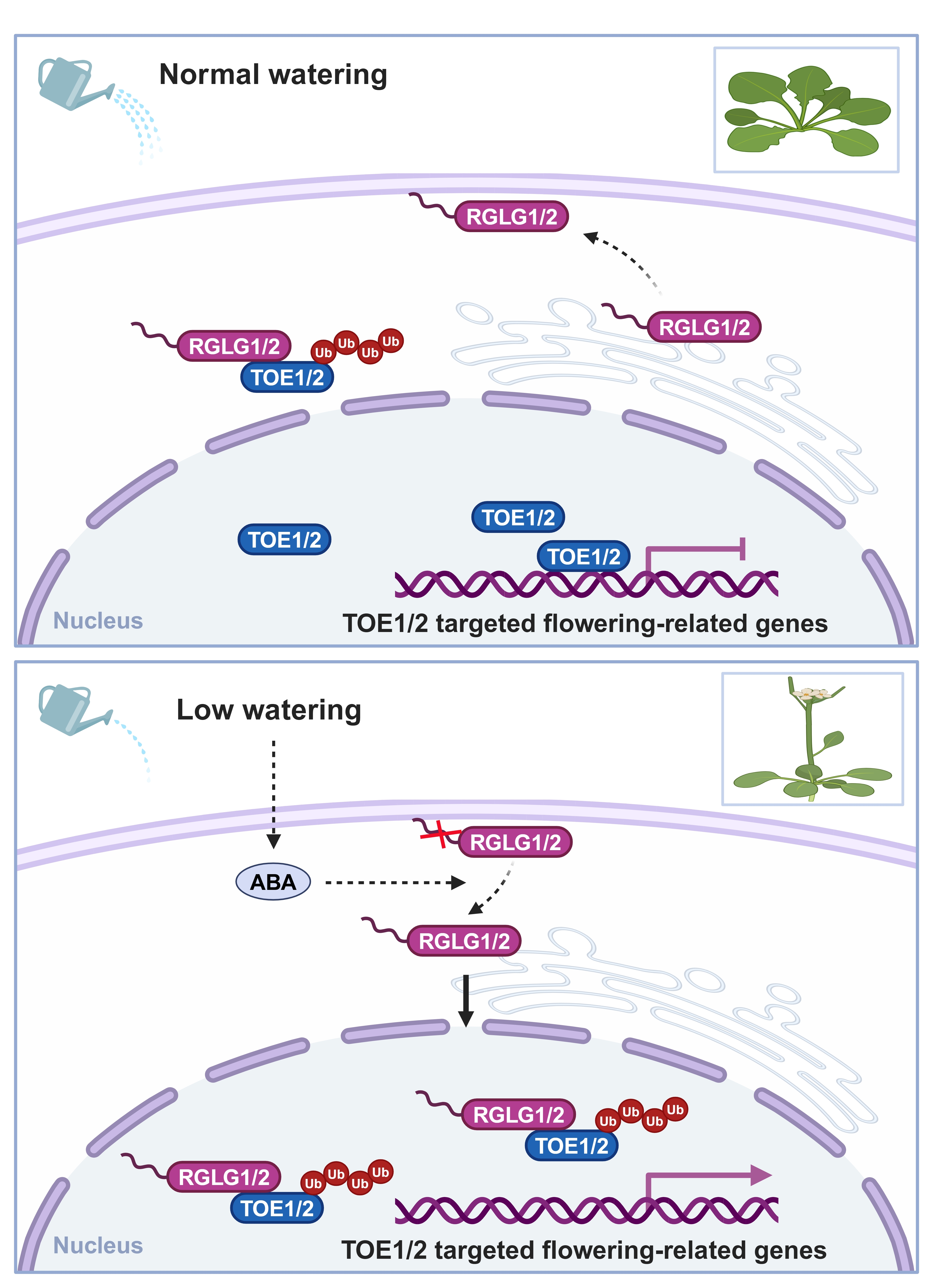 通过分子生物学以及遗传学等手段,该团队揭示RGLG1/2-TOE1/2信号在水分充足与水分相对缺乏的条件下的开花调控作用机制。在充足的水分条件下,RGLG1/2主要定位在细胞膜上,与TOE1/2蛋白的相互作用有限,使得TOE1/2能够抑制下游开花基因的转录,从而维持植物的典型开花表型。然而,在干旱条件下,植物体内的ABA信号上调,促使RGLG1/2从细胞膜转移到细胞核中,并与TOE1/2发生更强烈的相互作用。这种相互作用导致TOE1/2蛋白含量显著降低,解除其对相关开花基因的抑制,进而诱导植物早期开花(图1