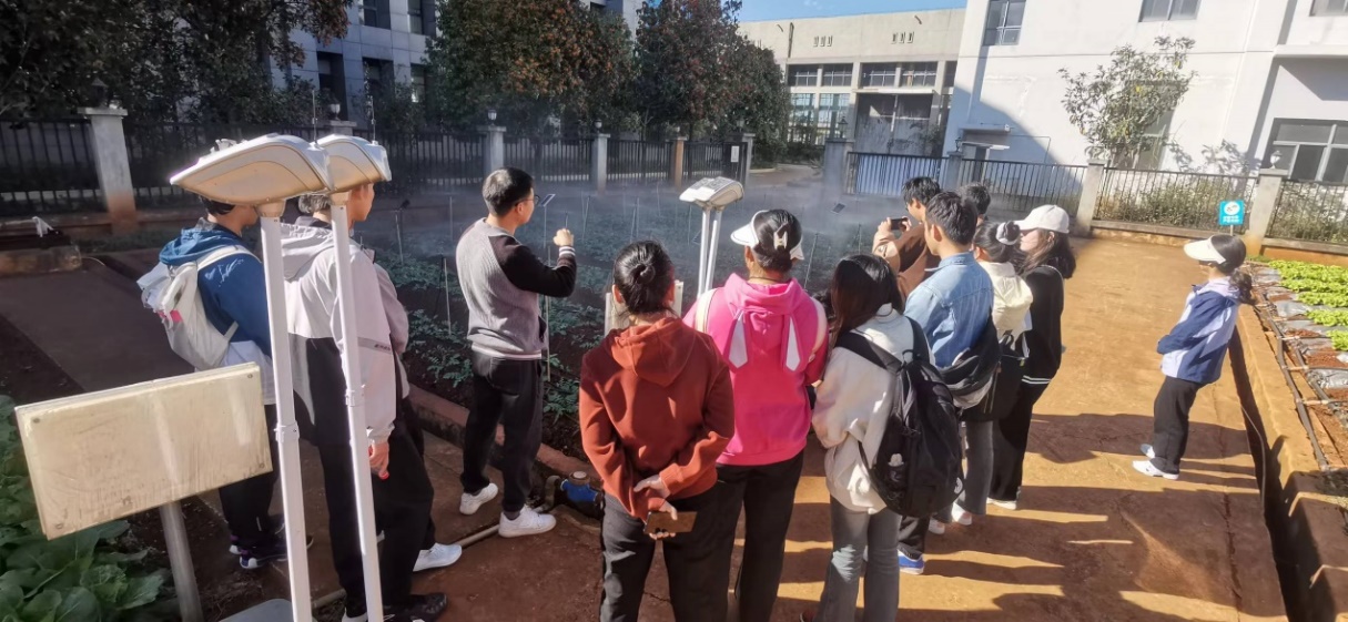 进入“高原立体气候条件作物需水云南省野外科学观测研究站”,首先由水科院薛洋老师为同学们介绍了站内节水灌溉模式:地里的黑色管子是节水灌溉系统,管子上每隔30cm有一个出水小孔,可以将水精准灌溉到根系周围,提供植物生长所需要水分。相比于传统的农田漫灌,这种节水灌溉模式在保证植物正常生长的同时,会大大节省用水量。通过手机APP远程控制灌溉,可以在手机上对滴灌、微喷灌等进行定量灌溉设置以及对智慧测坑远程控制模拟的地下水位等指标,输入确定参数后,系统即可自动工作。