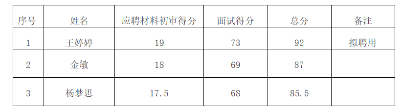 经对应聘材料初审和现场面试后,以下初审符合条件的3位应聘人员的综合成绩公布如下: