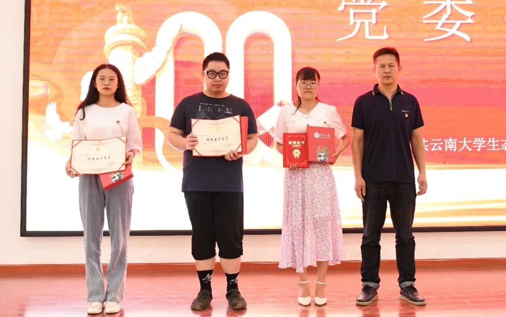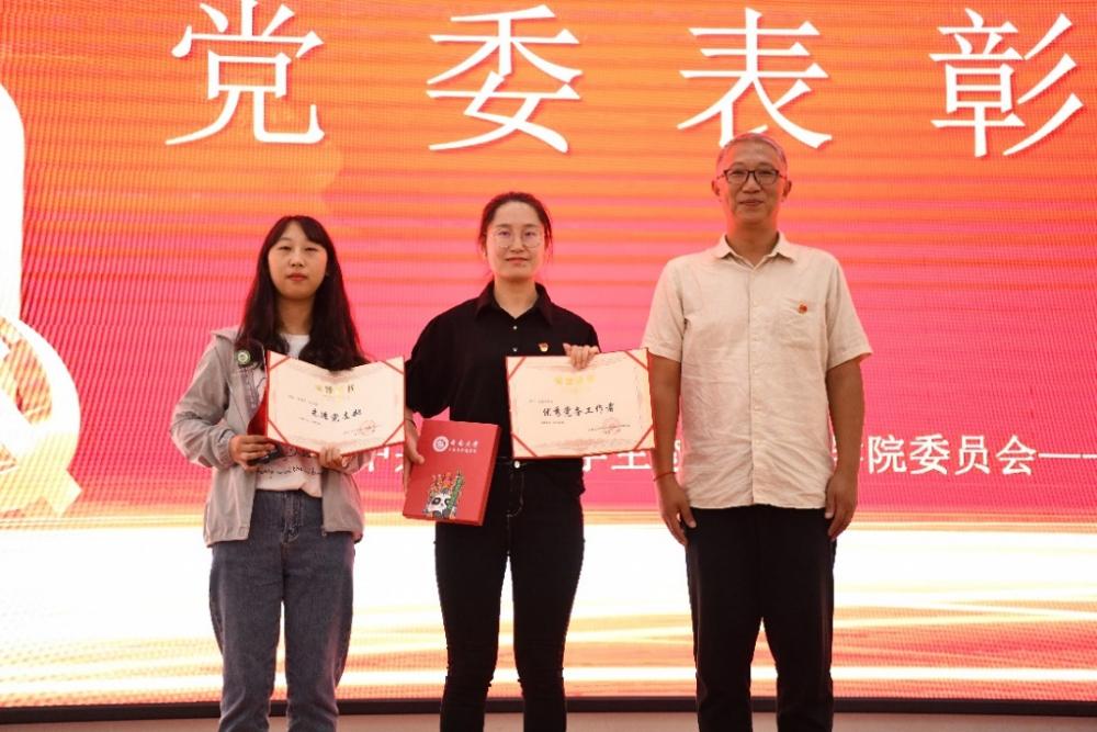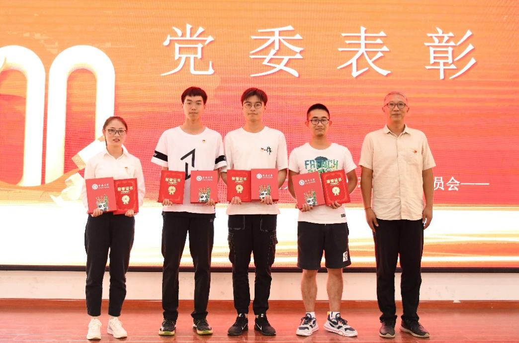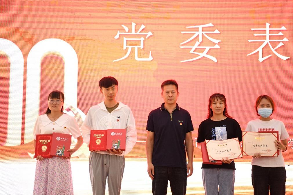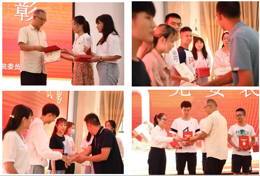 随后,举行了隆重的表彰仪式,对优秀共产党员、优秀党务工作者和先进基层党组织予以表彰。学生第一党支部,支部党员宗旨意识强,队伍素质高,在师生中有良好形象和较高威信,先锋模范作用和辐射示范作用明显,荣获2021年“先进党支部”称号。党支部书记陈容梅同志倾情奉献,用自己的行动和付出,诠释了一名党务工作者应具备的品质,荣获2021年“优秀党务工作者”称号。由党委书记廖俊涛为先进党支部——学生第一党支部和优秀党务工作者——陈容梅同志颁发荣誉证书和奖品。在2020年到2021年,我院涌现了一批优秀共产党员,其中教师党员爱岗敬业,在教书育人、科学研究、管理服务等工作中取得显著业绩,模范带头作用突出;学生党员有良好的思想品德,学习刻苦勤奋,成绩优良,积极参加党支部组织生活,在德智体美劳等各方面表现突出。由党委委员魏国岭同志和党委委员汤开磊同志为贾东瑞等24名优秀共产党员颁发奖状和奖品。