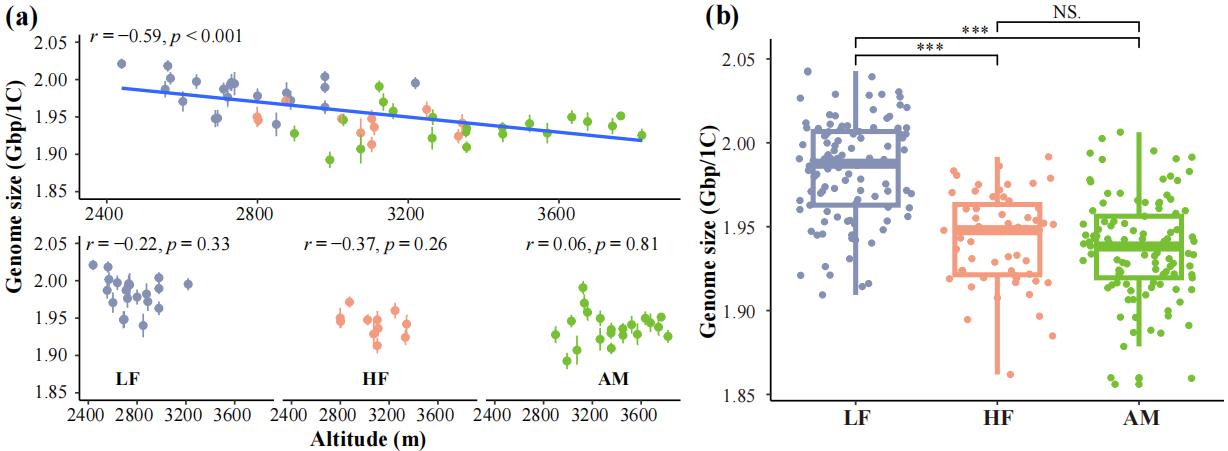 基因组大小(genome size)多样性在生物演化和生态适应中起着至关重要的作用。基因组大小变异的成因受到广泛关注,被Science两次列入125个世界性的科学难题。虽然大量的研究已经探索了基因组大小变异的原因,但种内基因组大小变异如何在不同生境中形成仍知之甚少。有多种假说用于解释基因组大小多样性的成因,目前比较受关注且存在较大争议的是大基因组限制假说(The large-genome constraint hypothesis)。该假说认为大基因组生物能形成大的细胞体积从而限制生理活性、降低细胞分裂速率、增加生物对氮和磷的需求。由此可推测基因组越大的物种/个体的可塑性或适应能力越低。大基因组限制假说的证据主要来自物种间比较,是否适用于种内水平的基因组大小变异仍在很大程度上是未知的。
