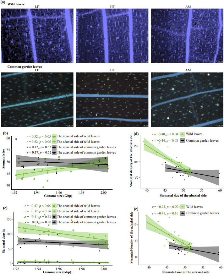 3)以往的研究常用气孔性状衡量基因组大小。我们的野外测量数据显示基因组大小与气孔大小呈正相关,与气孔密度呈负相关。然而,在同质园种植后,这些显著的相关性消失了,这表明了气孔性状的可塑性且不完全由基因组大小决定。此外,气孔大小与密度的相关性从野外到同质园也发生了显著变化,进一步表明环境因子在气孔性状可塑性中占主导地位。从野外到同质园环境,植物所受的选择压力减小可能是基因组-气孔大小关系的解耦的原因。该结果表明,基因组与气孔大小的关系会因环境的变化而改变,因此基因组大小的预测不能依赖于气孔性状。
